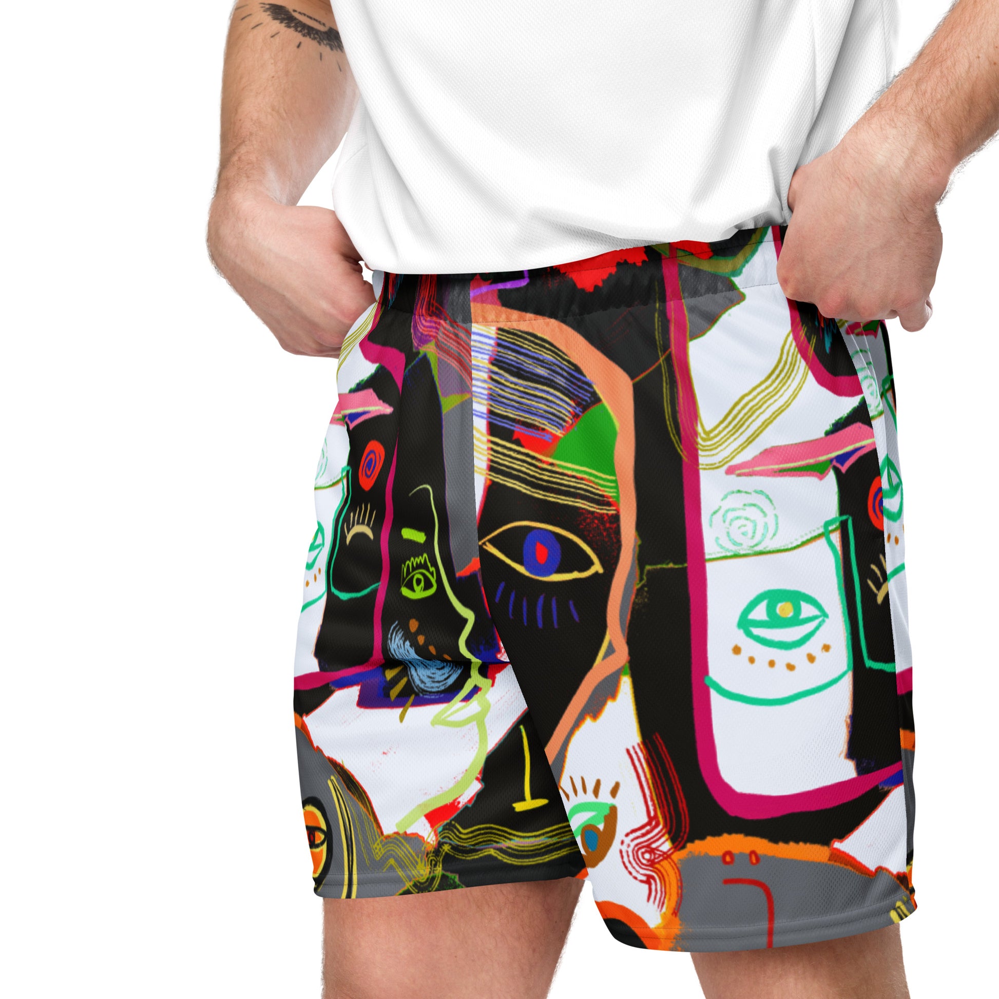 Self-designed Picasso midnight art shorts. Whether you’re hitting the gym, running errands or enjoying an outdoor activity, they’ll be your trusty companion. Look good, feel good, and stay comfortable, all with the unisex mesh shorts.